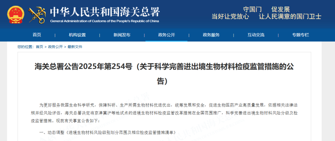 为更好服务我国生命科学研究,保障科研、生产所需生物材料优进优出,统筹发展和安全,促进生物医药产业高质量发展,依据相关法律法规并经风险评估,海关总署决定将京津冀沪等地试点的进境生物材料检疫监管改革措施在全国范围推广,科学完善进出境生物材料风险分级及检疫监管措施。现就有关事宜公告如下: