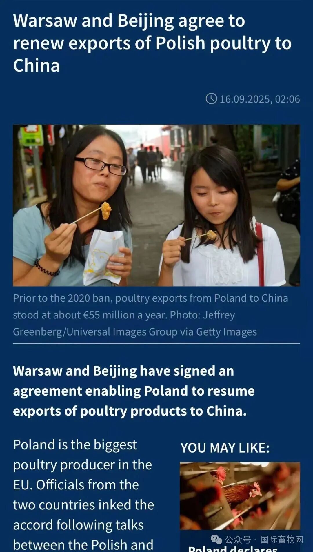 据悉,中国都因2020年和2024年9月波兰暴发高致病性禽流感疫情而暂停相关进口。自2014年以来,波兰一直是欧盟最大禽肉生产国,占欧盟禽肉产量的20%以上 。