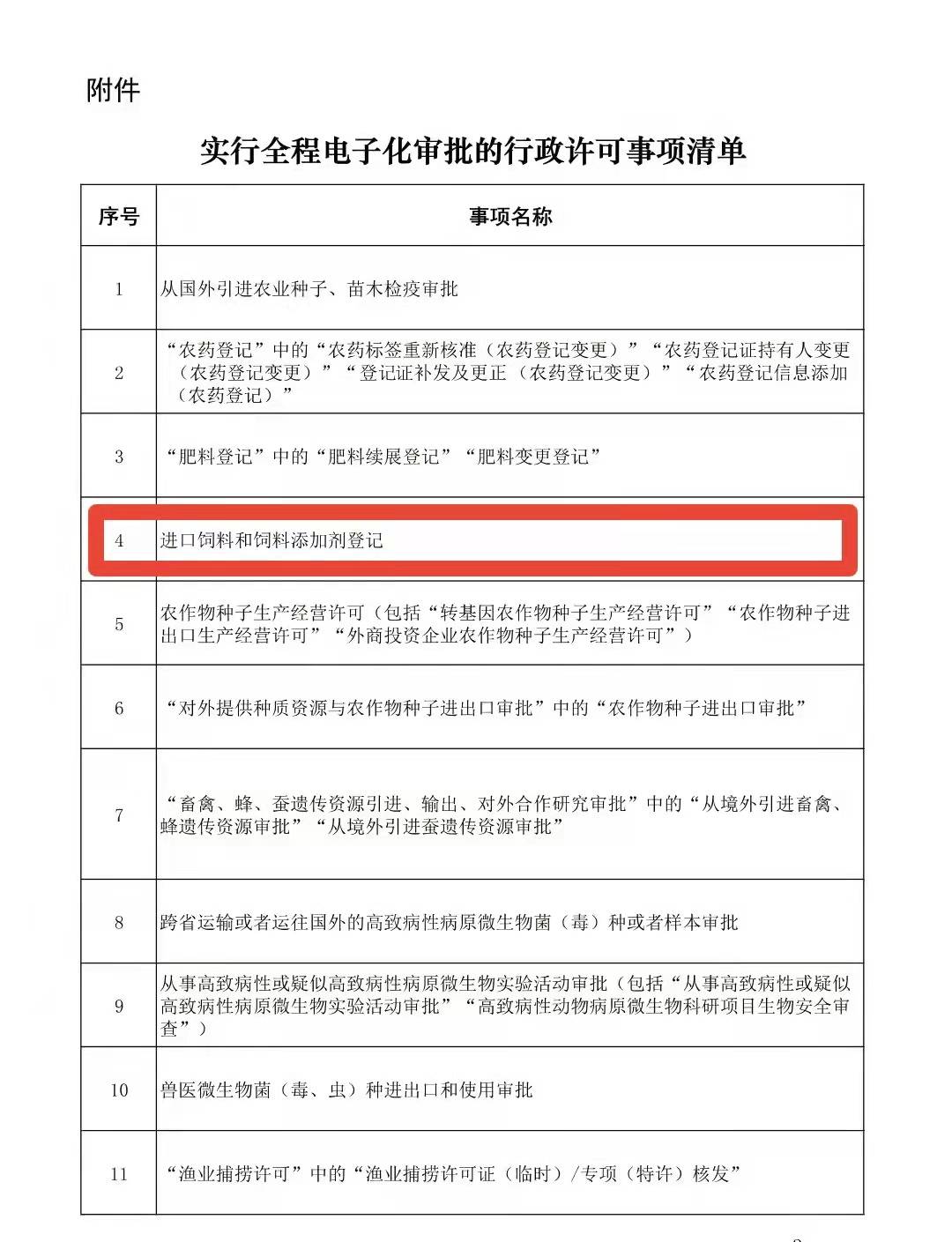 根据中华人民共和国农业农村部公告 第492号显示,为深入贯彻落实国务院“放管服”改革精神,提高审批效率、优化服务水平,进一步方便行政许可申请人,农业农村部决定对“从国外引进农业种子、苗木检疫审批;进口饲料和饲料添加剂登记”等11项行政许可事项(含部分子项或许可情形,见附件)实施全程电子化审批。